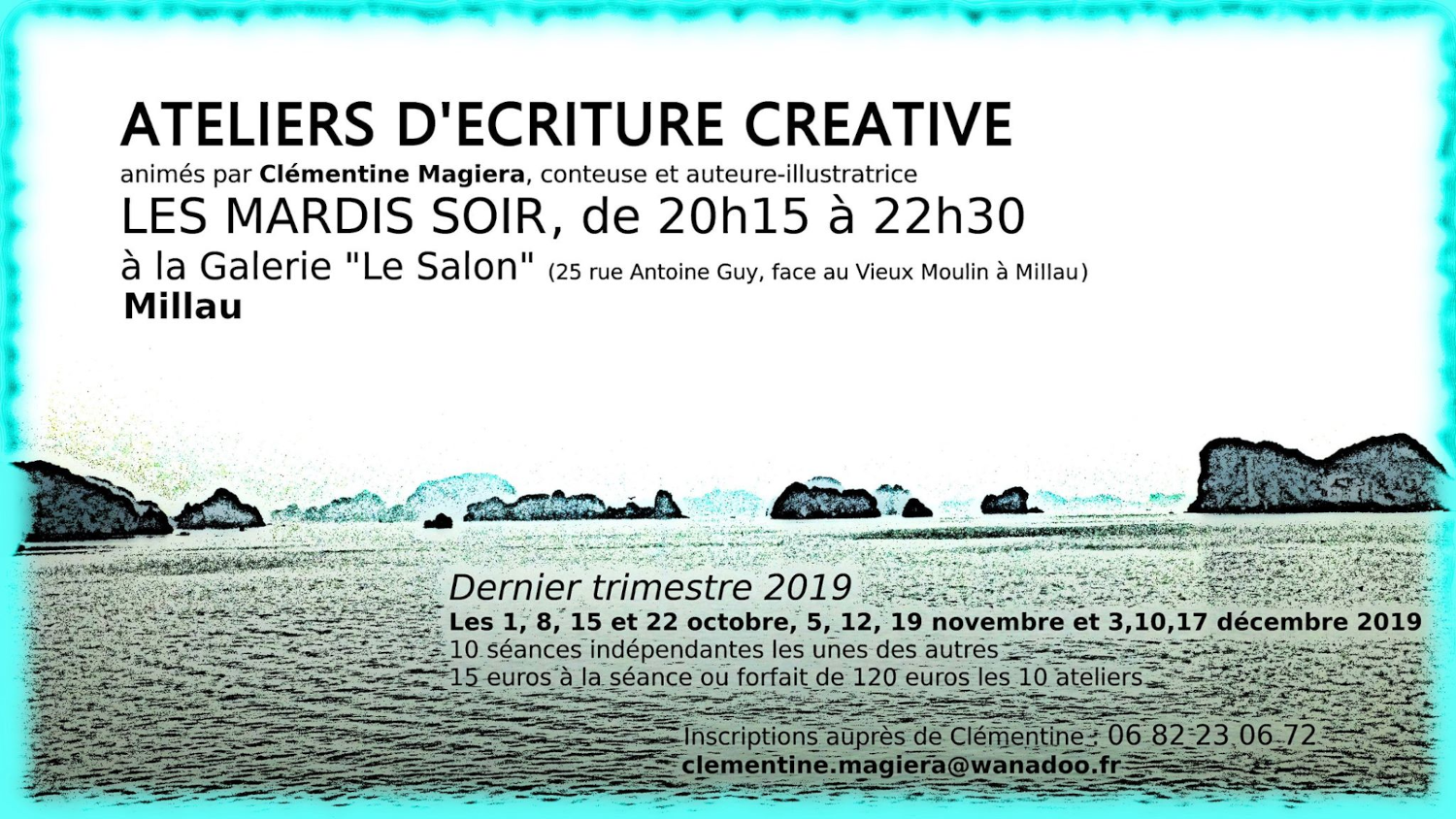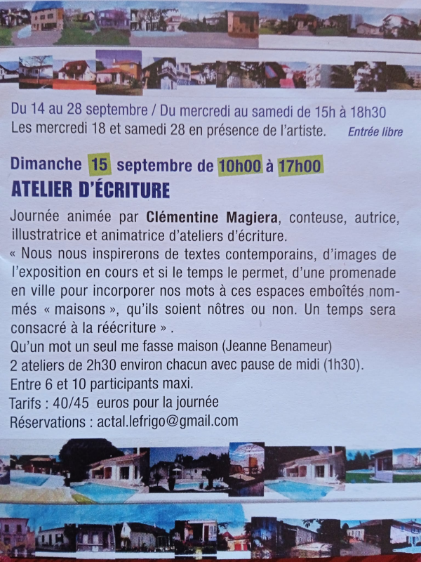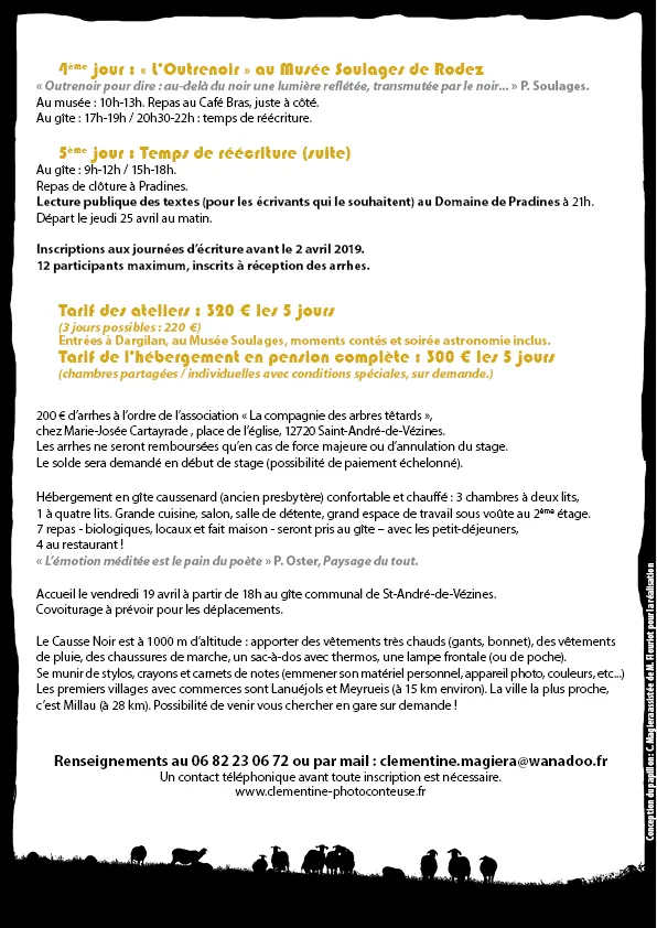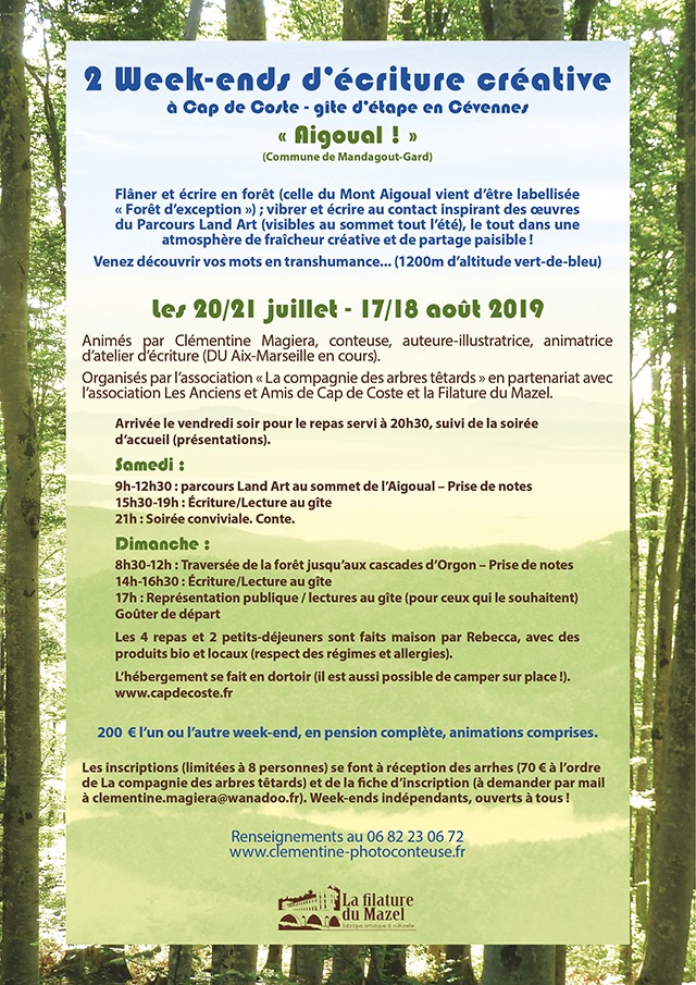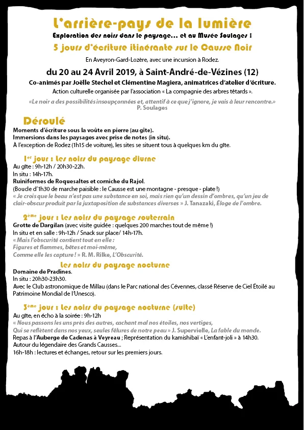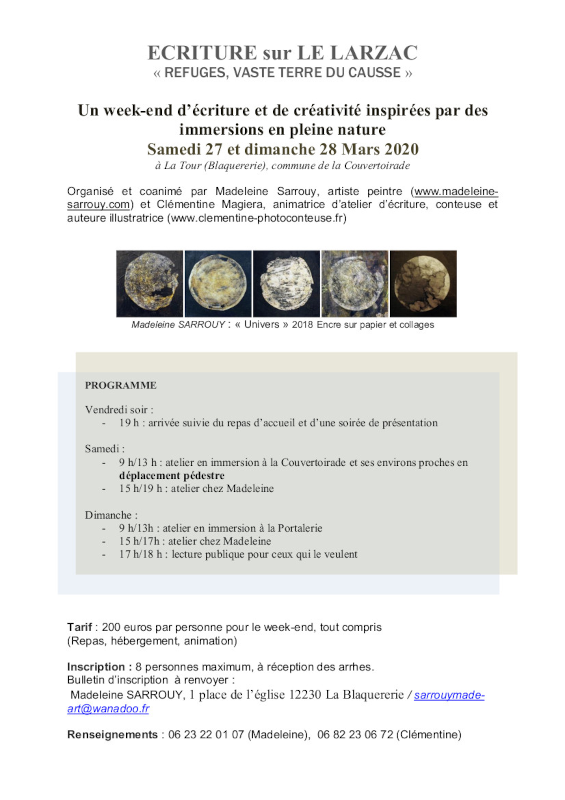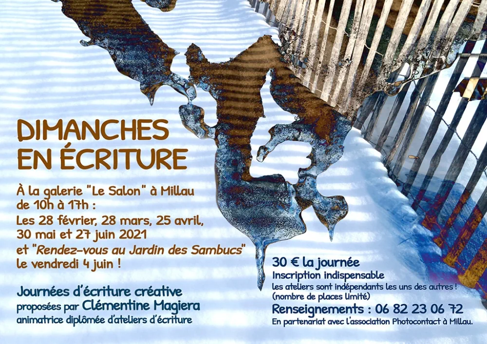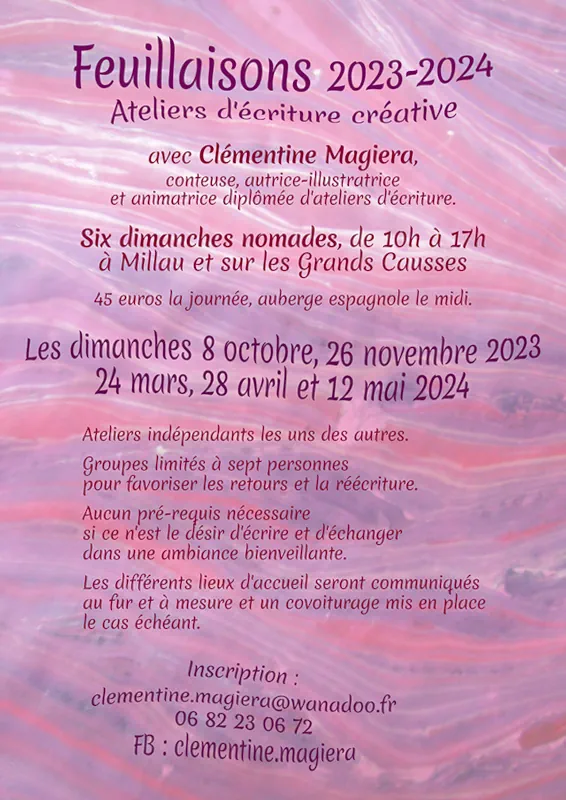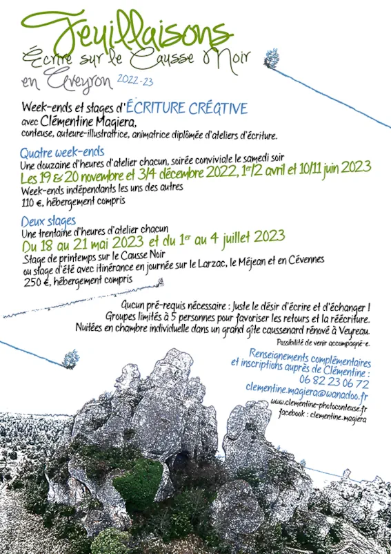 J’anime depuis trois ans des ateliers mensuels d’écriture à l’IUT de Rodez avec l’Université du Temps Libre du Rouergue, ainsi qu’à la médiathèque d’Onet-le-Château. Ces ateliers sont complets cette année mais il est possible de s’inscrire ponctuellement aux Dimanches en écriture que je propose avec les différentes saisons de l’association « Feuillaisons » à Millau, sur les Grands Causses ou en Cévennes.