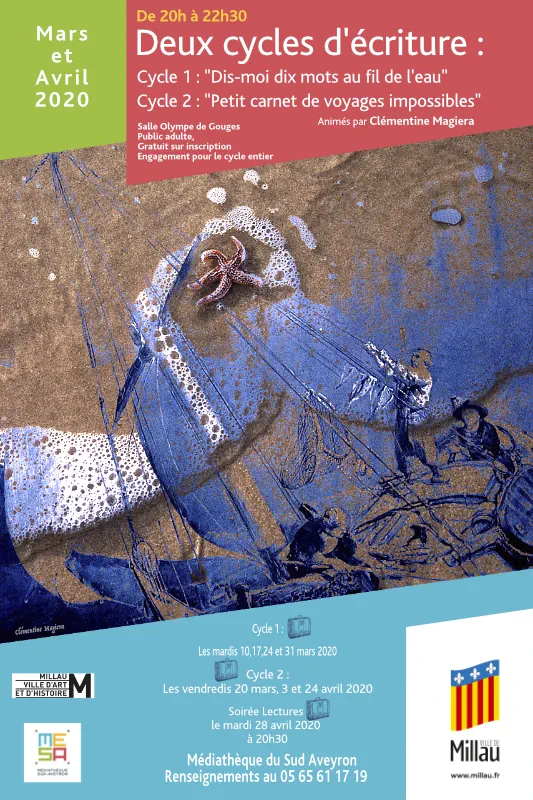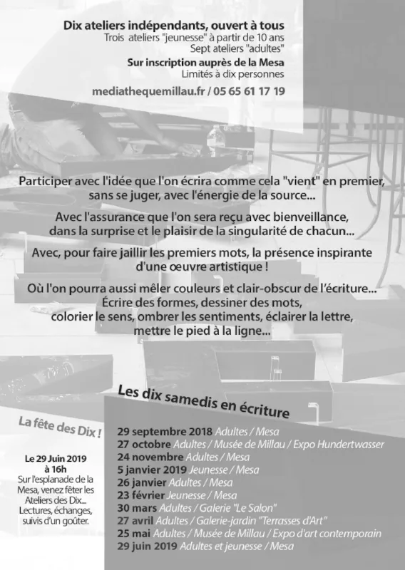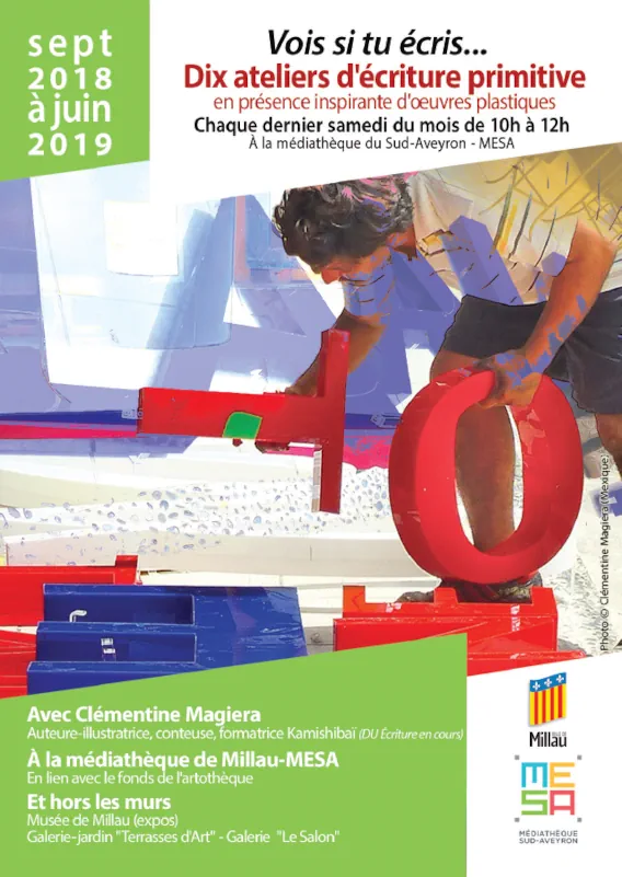 j’anime des ateliers réguliers ou ponctuels depuis 2017 dans les musées (Soulages, Musée de Millau et des Grands Causses), au sein d’expositions (Hundertwasser, à la galerie « Le Salon », au « Frigo » – Albi), dans le cadre de festivals (Festivalet des Tisseurs de mots – Auvergne), avec l’UTL du Rouergue, les médiathèques de Rodez, Millau, Onet-le-Château, avec les associations « Feuillaisons »- 12, « L’atelier des Monts Brumeux », « Culture Aigoual », et au Climatographe – 30.